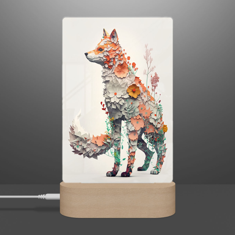 Součástí balení je akrylové sklo dle výběru, dřevěný RGB LED stojánek a napájecí USB kabel.