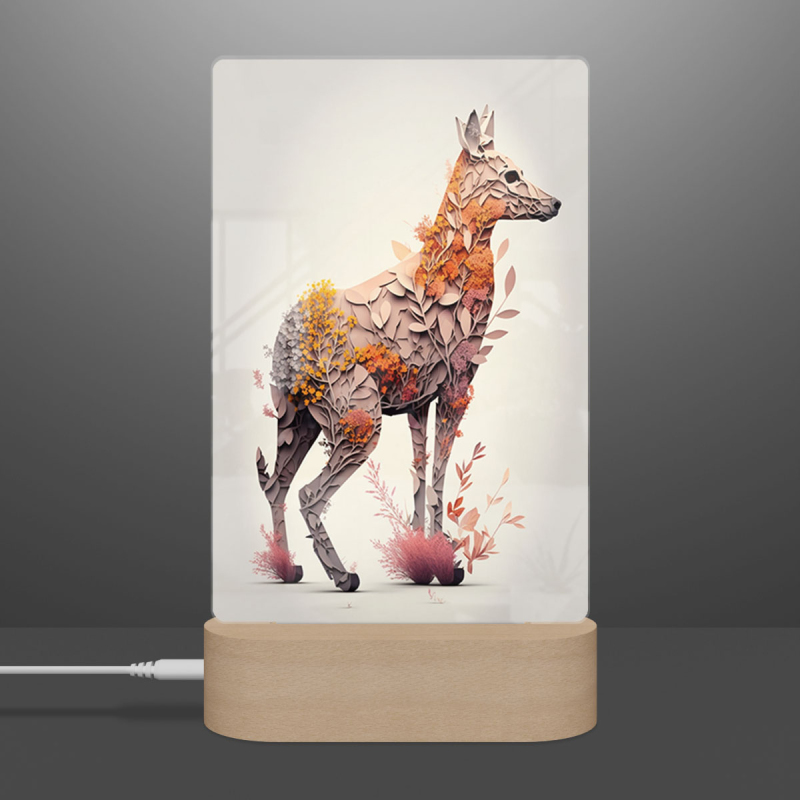Součástí balení je akrylové sklo dle výběru, dřevěný RGB LED stojánek a napájecí USB kabel.