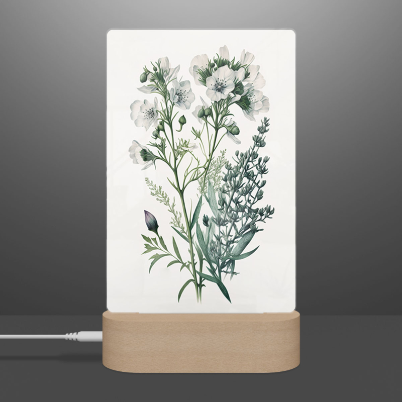 Součástí balení je akrylové sklo dle výběru, dřevěný RGB LED stojánek a napájecí USB kabel.