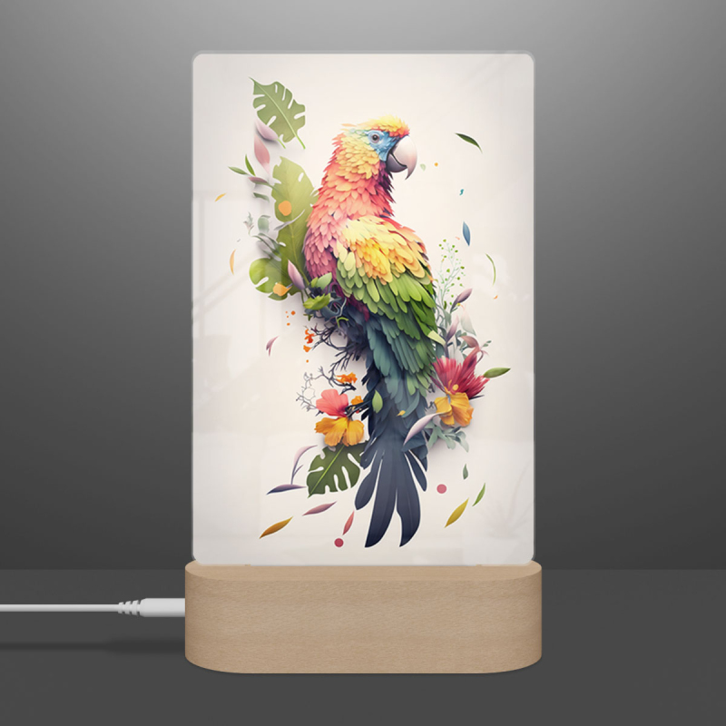 Součástí balení je akrylové sklo dle výběru, dřevěný RGB LED stojánek a napájecí USB kabel.