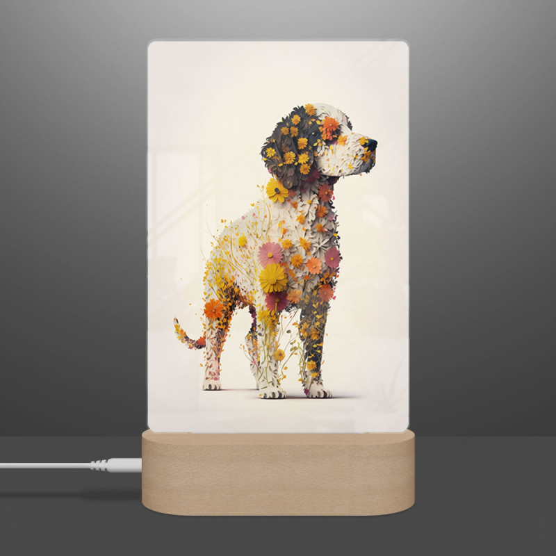 Součástí balení je akrylové sklo dle výběru, dřevěný RGB LED stojánek a napájecí USB kabel.