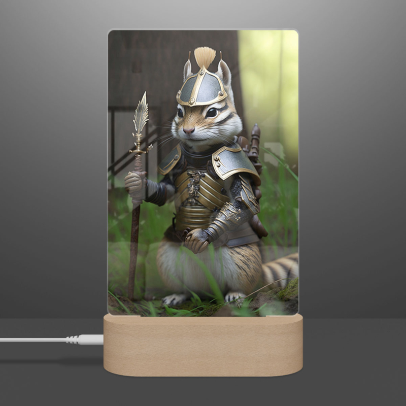 Součástí balení je akrylové sklo dle výběru, dřevěný RGB LED stojánek a napájecí USB kabel.