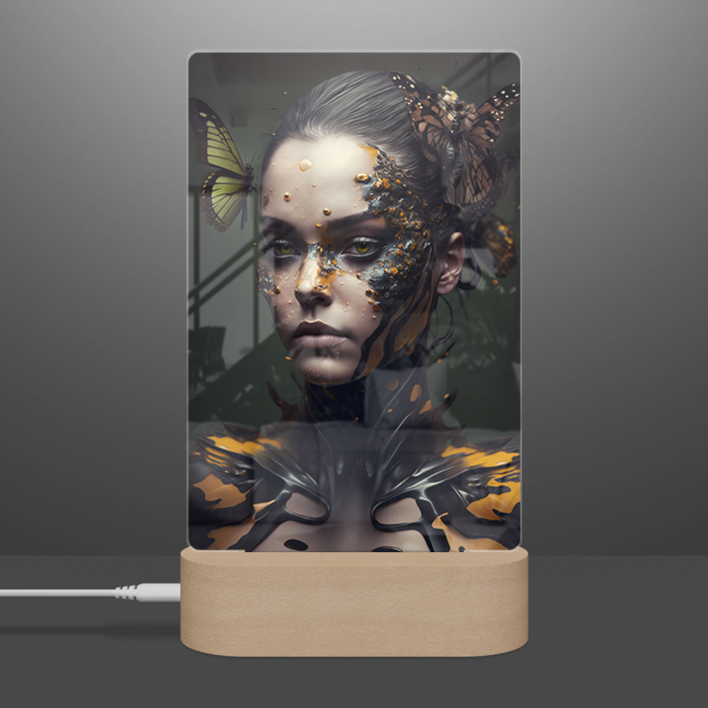 Součástí balení je akrylové sklo dle výběru, dřevěný RGB LED stojánek a napájecí USB kabel.