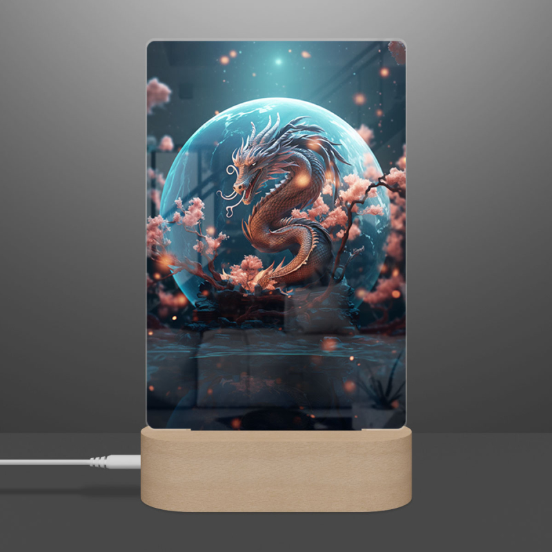 Součástí balení je akrylové sklo dle výběru, dřevěný RGB LED stojánek a napájecí USB kabel.