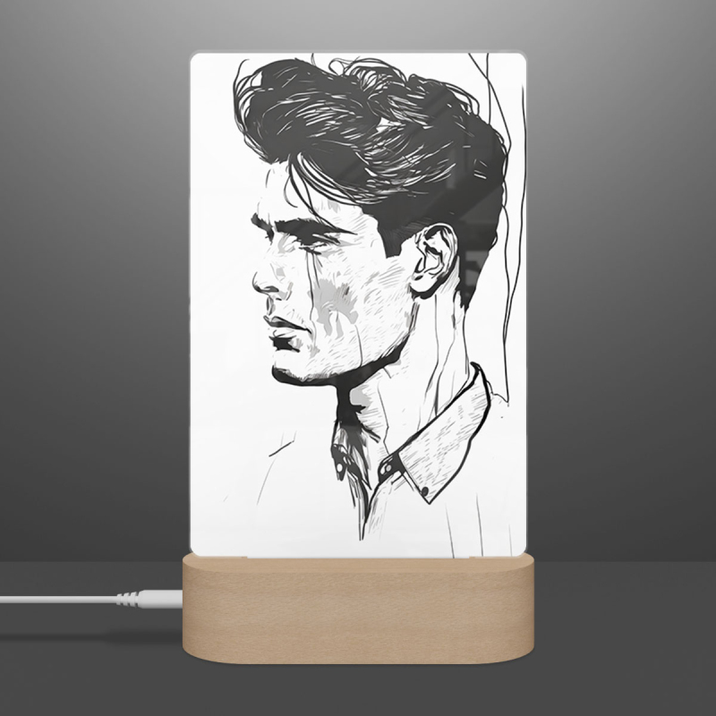 Součástí balení je akrylové sklo dle výběru, dřevěný RGB LED stojánek a napájecí USB kabel.