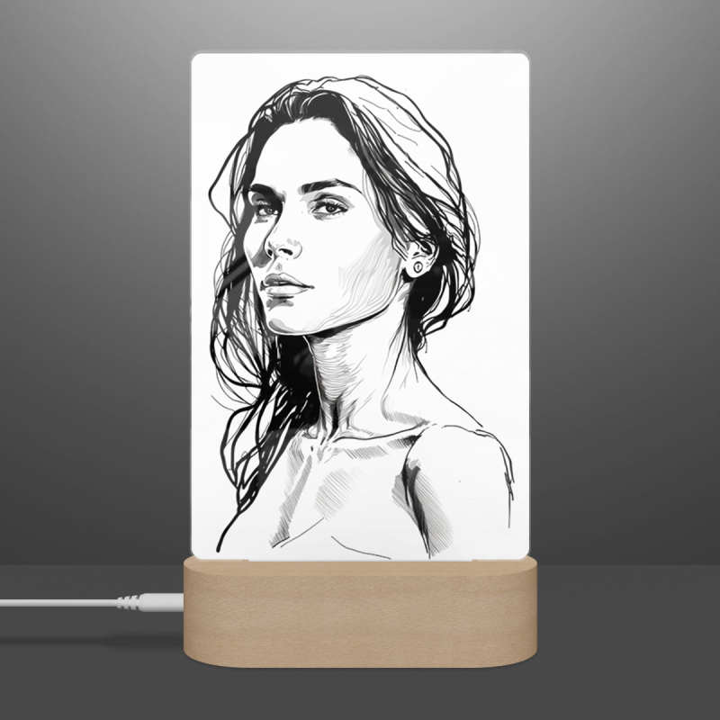 Součástí balení je akrylové sklo dle výběru, dřevěný RGB LED stojánek a napájecí USB kabel.