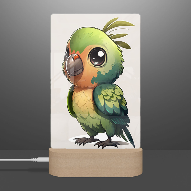 Součástí balení je akrylové sklo dle výběru, dřevěný RGB LED stojánek a napájecí USB kabel.