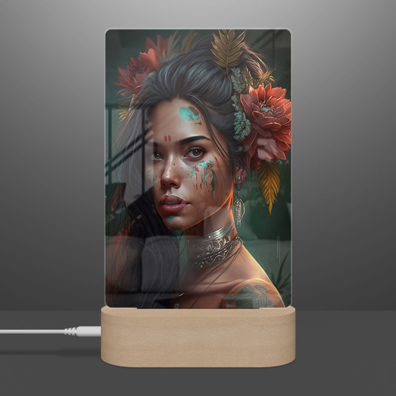 Součástí balení je akrylové sklo dle výběru, dřevěný RGB LED stojánek a napájecí USB kabel.