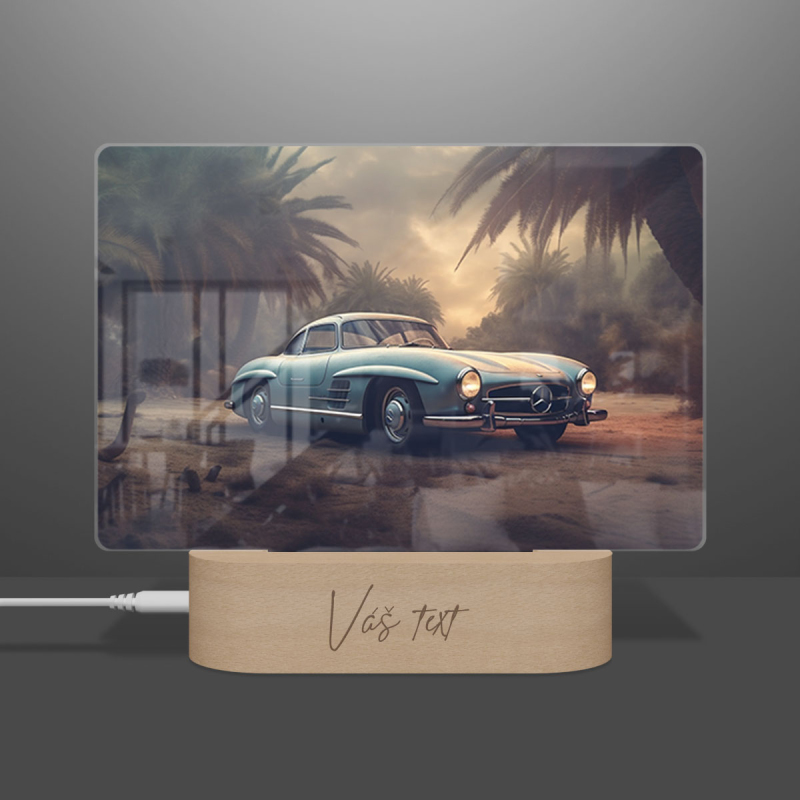 Součástí balení je akrylové sklo dle výběru, dřevěný RGB LED stojánek a napájecí USB kabel.