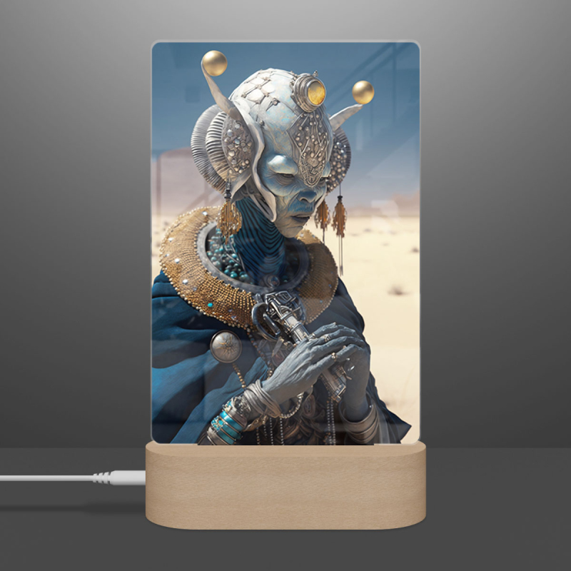 Součástí balení je akrylové sklo dle výběru, dřevěný RGB LED stojánek a napájecí USB kabel.