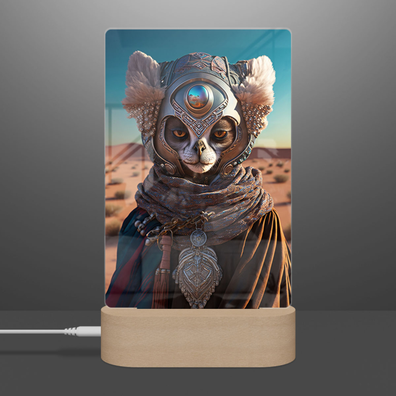Součástí balení je akrylové sklo dle výběru, dřevěný RGB LED stojánek a napájecí USB kabel.