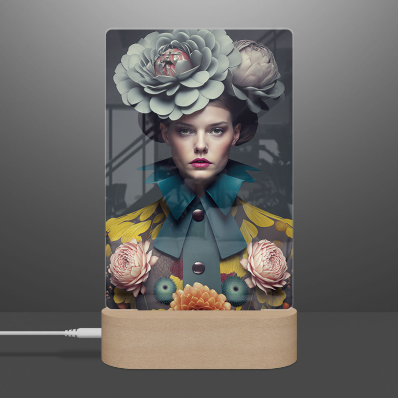 Součástí balení je akrylové sklo dle výběru, dřevěný RGB LED stojánek a napájecí USB kabel.
