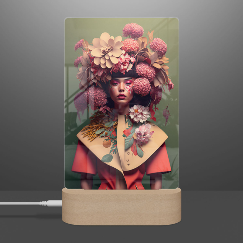 Součástí balení je akrylové sklo dle výběru, dřevěný RGB LED stojánek a napájecí USB kabel.