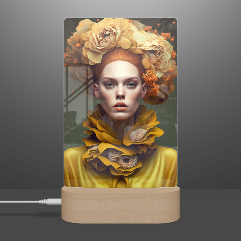 Součástí balení je akrylové sklo dle výběru, dřevěný RGB LED stojánek a napájecí USB kabel.