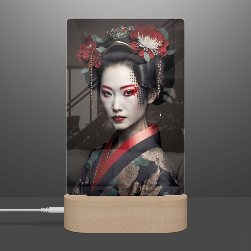 Součástí balení je akrylové sklo dle výběru, dřevěný RGB LED stojánek a napájecí USB kabel.