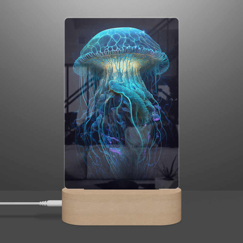 Součástí balení je akrylové sklo dle výběru, dřevěný RGB LED stojánek a napájecí USB kabel.