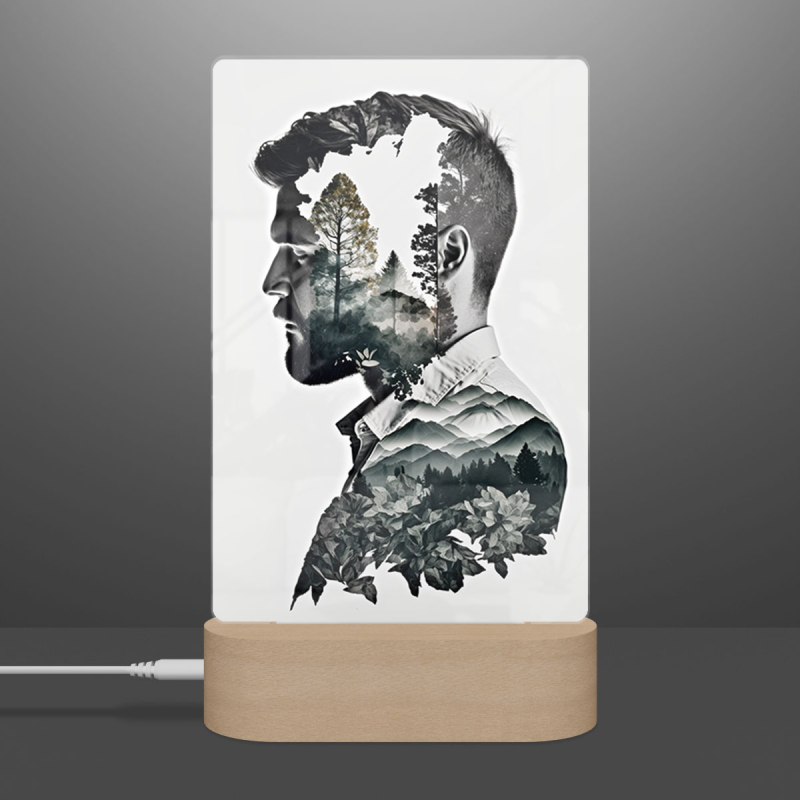 Součástí balení je akrylové sklo dle výběru, dřevěný RGB LED stojánek a napájecí USB kabel.