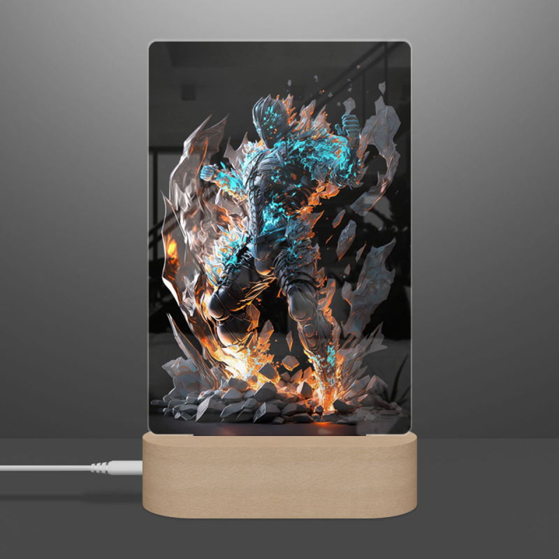Součástí balení je akrylové sklo dle výběru, dřevěný RGB LED stojánek a napájecí USB kabel.
