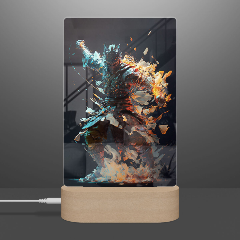Součástí balení je akrylové sklo dle výběru, dřevěný RGB LED stojánek a napájecí USB kabel.