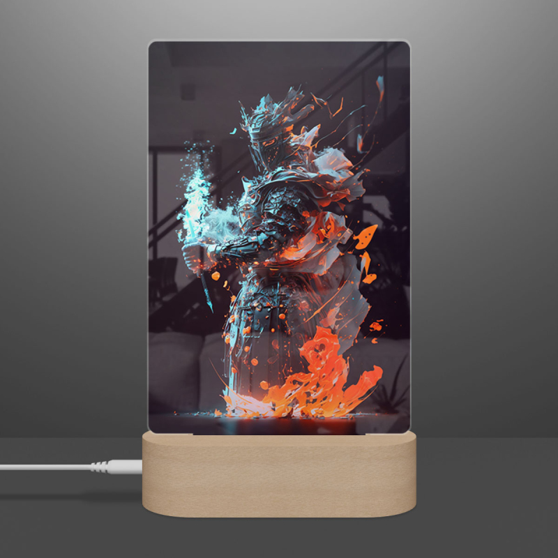Součástí balení je akrylové sklo dle výběru, dřevěný RGB LED stojánek a napájecí USB kabel.