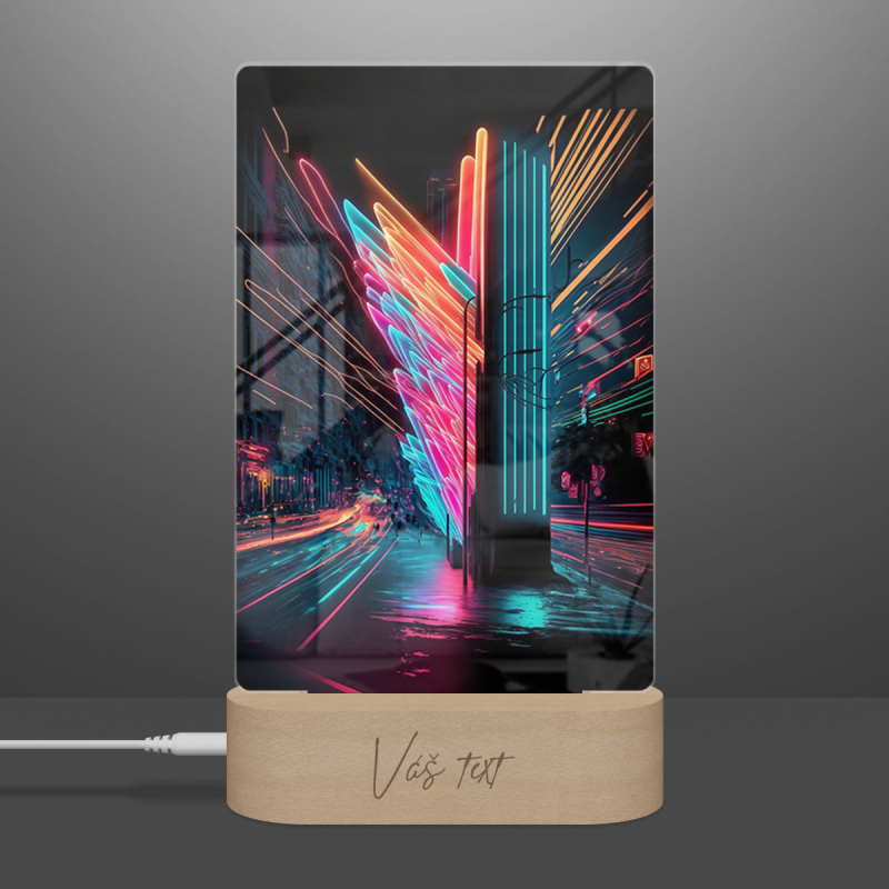 Součástí balení je akrylové sklo dle výběru, dřevěný RGB LED stojánek a napájecí USB kabel.