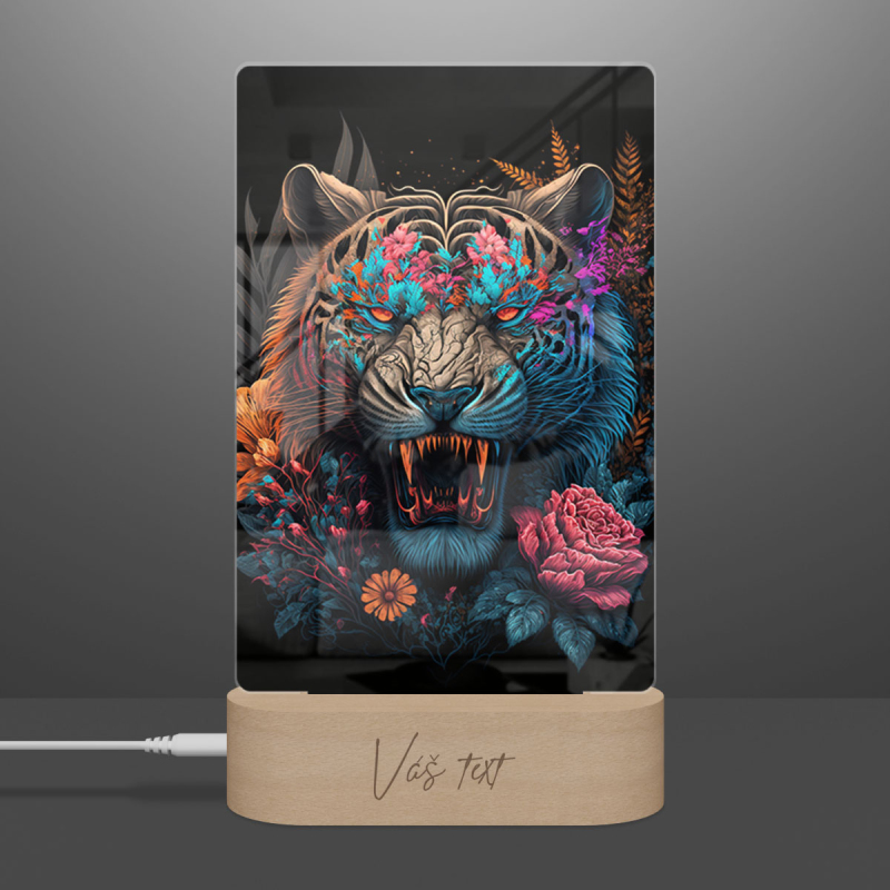 Součástí balení je akrylové sklo dle výběru, dřevěný RGB LED stojánek a napájecí USB kabel.
