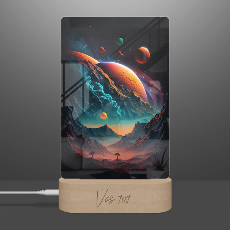 Součástí balení je akrylové sklo dle výběru, dřevěný RGB LED stojánek a napájecí USB kabel.