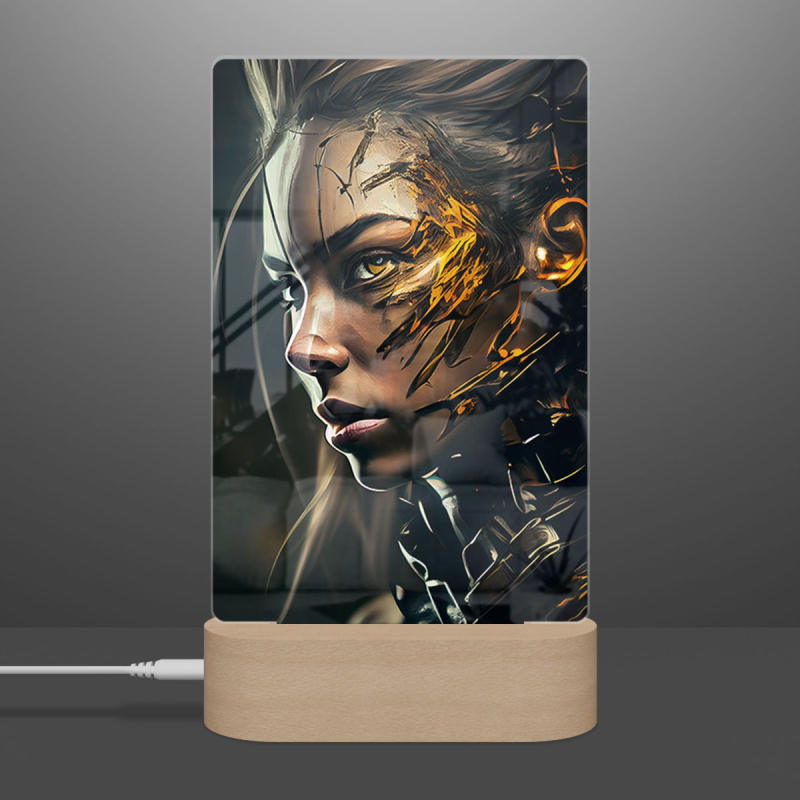 Součástí balení je akrylové sklo dle výběru, dřevěný RGB LED stojánek a napájecí USB kabel.