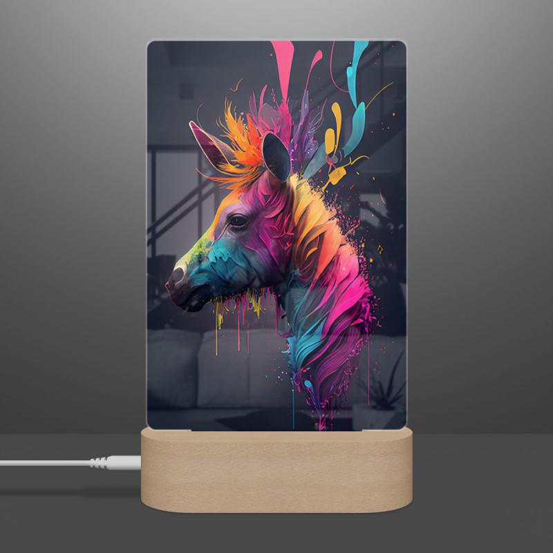 Součástí balení je akrylové sklo dle výběru, dřevěný RGB LED stojánek a napájecí USB kabel.