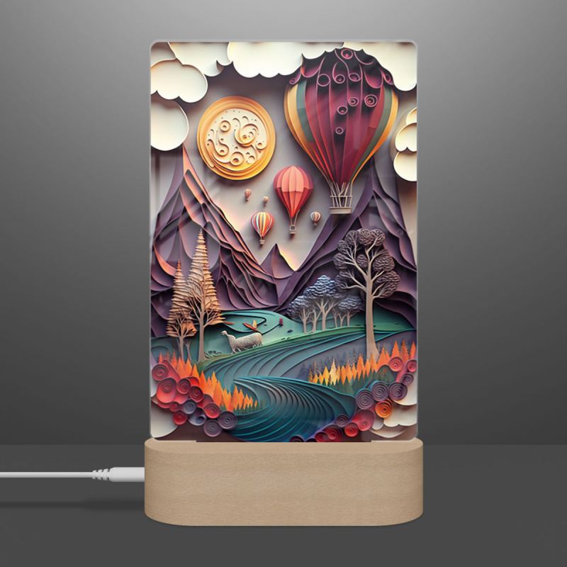 Součástí balení je akrylové sklo dle výběru, dřevěný RGB LED stojánek a napájecí USB kabel.