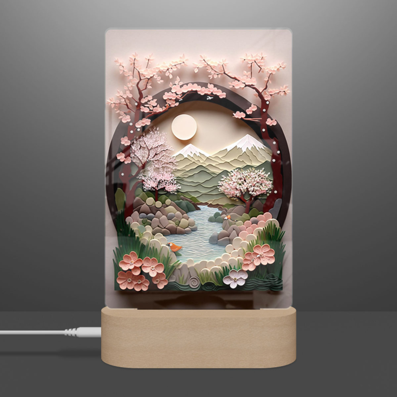 Součástí balení je akrylové sklo dle výběru, dřevěný RGB LED stojánek a napájecí USB kabel.