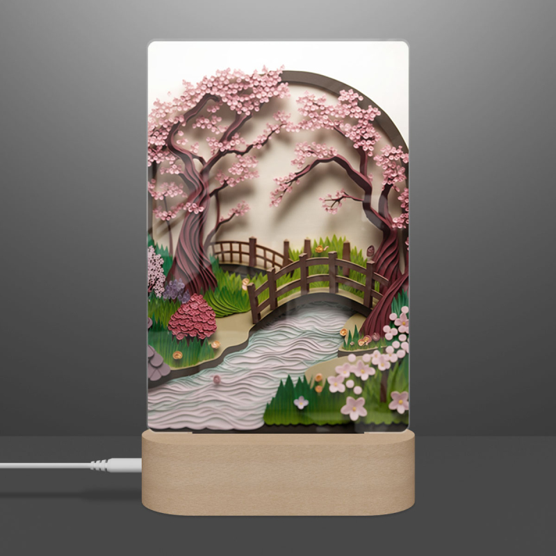 Součástí balení je akrylové sklo dle výběru, dřevěný RGB LED stojánek a napájecí USB kabel.