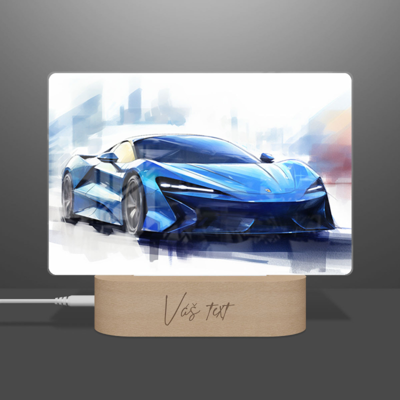 Součástí balení je akrylové sklo dle výběru, dřevěný RGB LED stojánek a napájecí USB kabel.