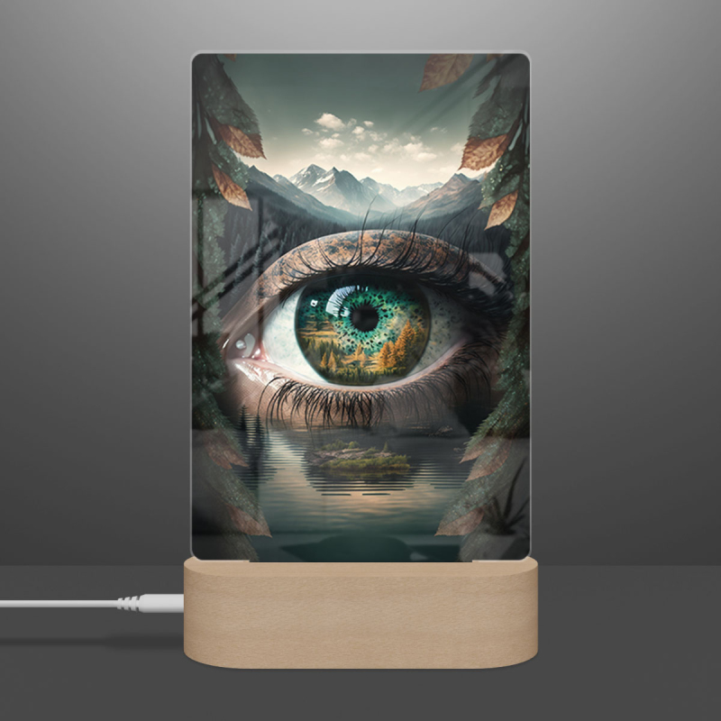 Součástí balení je akrylové sklo dle výběru, dřevěný RGB LED stojánek a napájecí USB kabel.