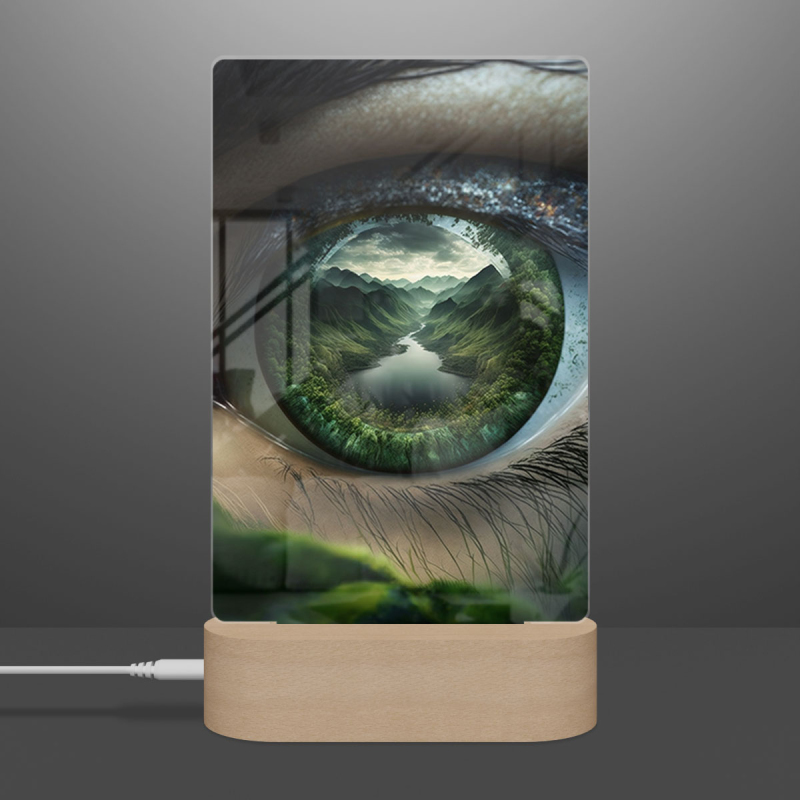 Součástí balení je akrylové sklo dle výběru, dřevěný RGB LED stojánek a napájecí USB kabel.