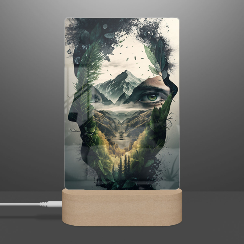 Součástí balení je akrylové sklo dle výběru, dřevěný RGB LED stojánek a napájecí USB kabel.