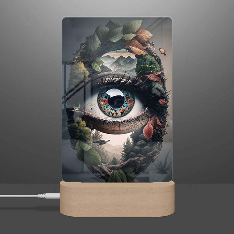 Součástí balení je akrylové sklo dle výběru, dřevěný RGB LED stojánek a napájecí USB kabel.