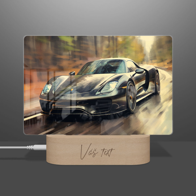 Součástí balení je akrylové sklo dle výběru, dřevěný RGB LED stojánek a napájecí USB kabel.