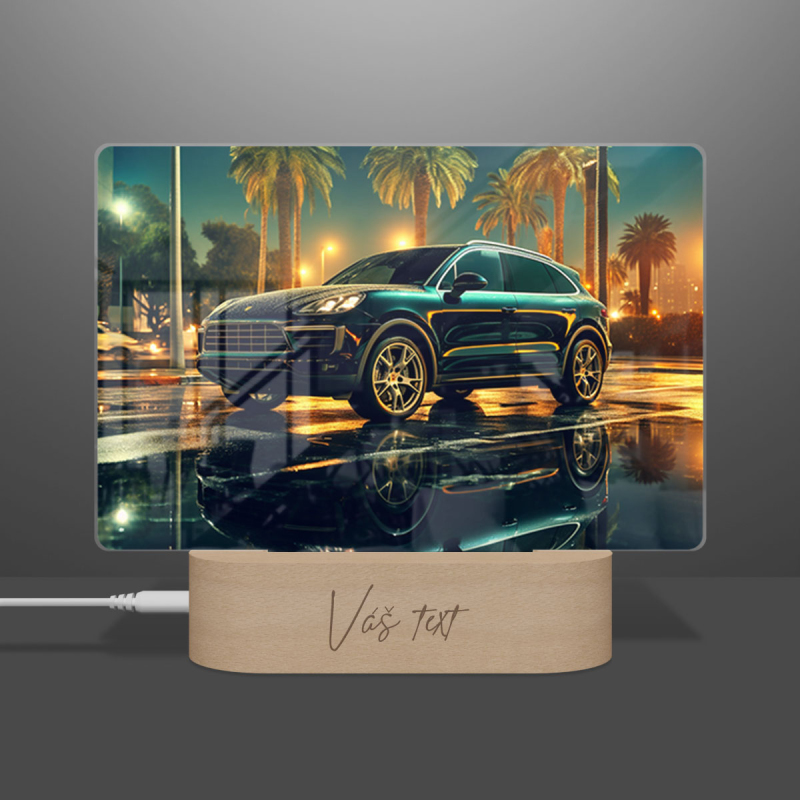 Součástí balení je akrylové sklo dle výběru, dřevěný RGB LED stojánek a napájecí USB kabel.