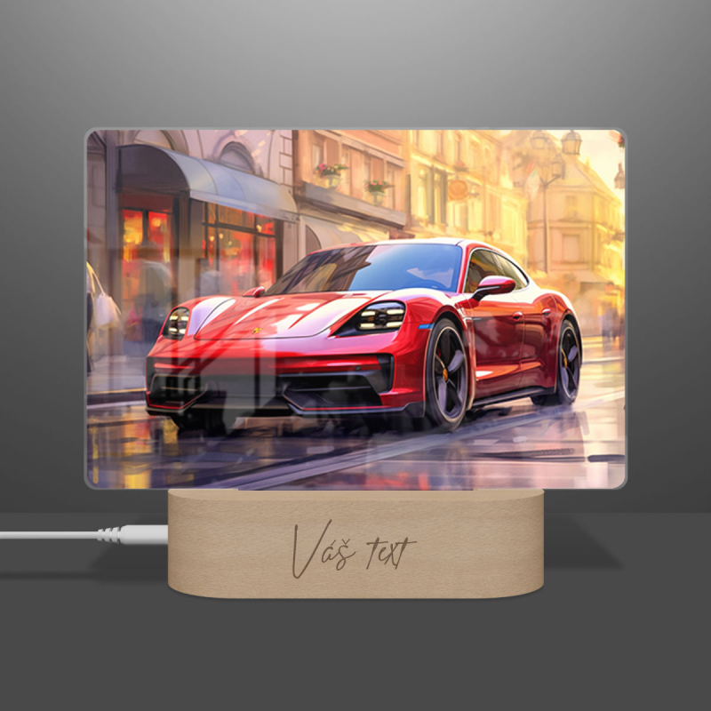 Součástí balení je akrylové sklo dle výběru, dřevěný RGB LED stojánek a napájecí USB kabel.