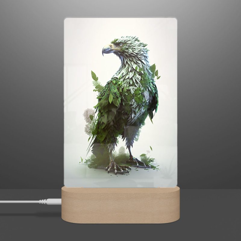 Součástí balení je akrylové sklo dle výběru, dřevěný RGB LED stojánek a napájecí USB kabel.