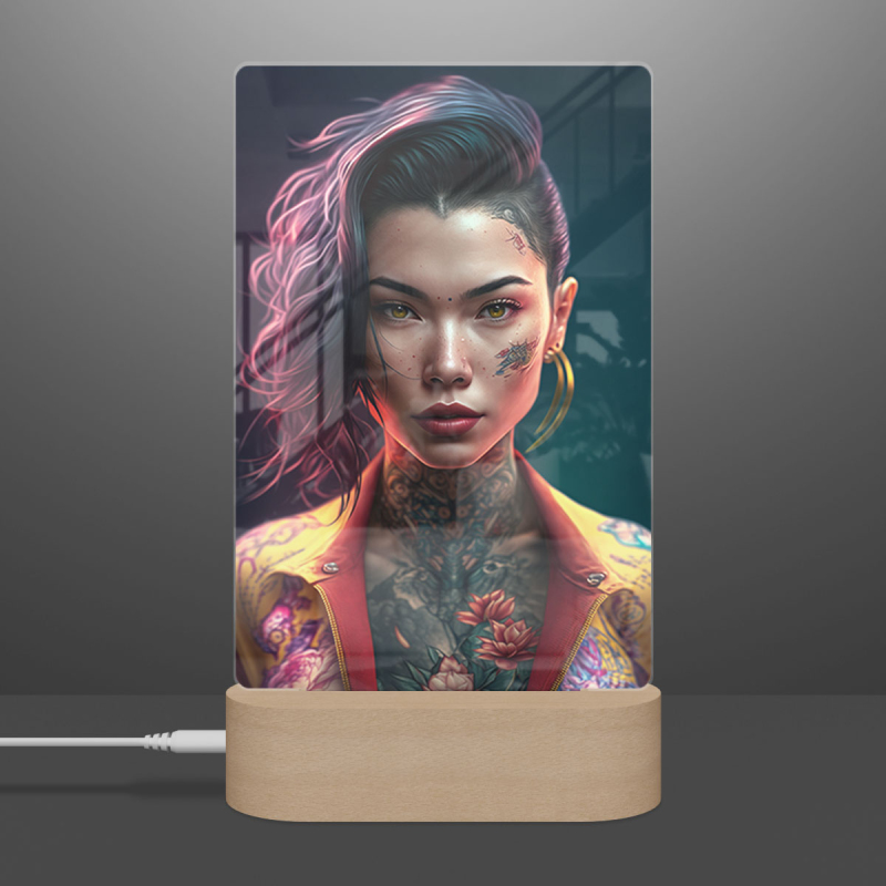 Součástí balení je akrylové sklo dle výběru, dřevěný RGB LED stojánek a napájecí USB kabel.