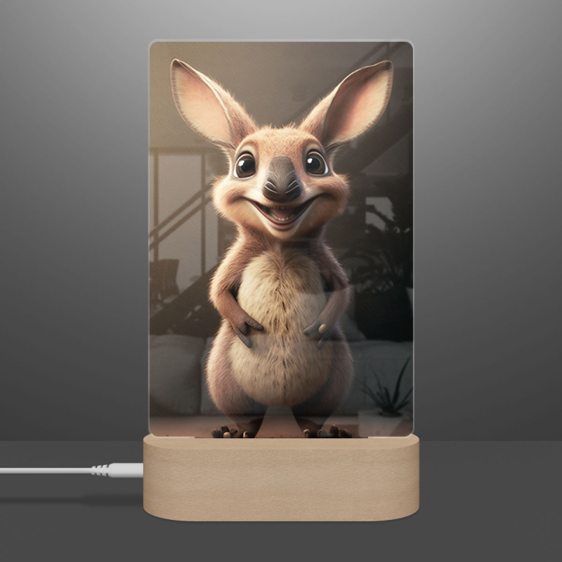 Součástí balení je akrylové sklo dle výběru, dřevěný RGB LED stojánek a napájecí USB kabel.