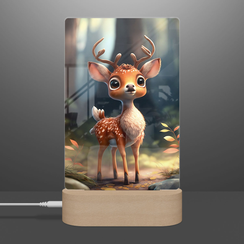 Součástí balení je akrylové sklo dle výběru, dřevěný RGB LED stojánek a napájecí USB kabel.