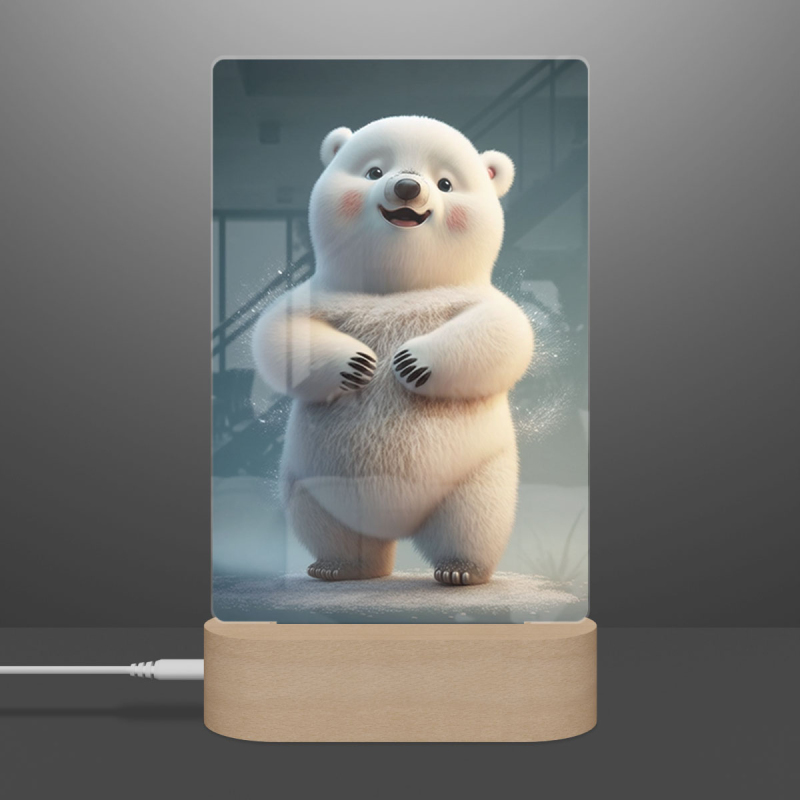Součástí balení je akrylové sklo dle výběru, dřevěný RGB LED stojánek a napájecí USB kabel.
