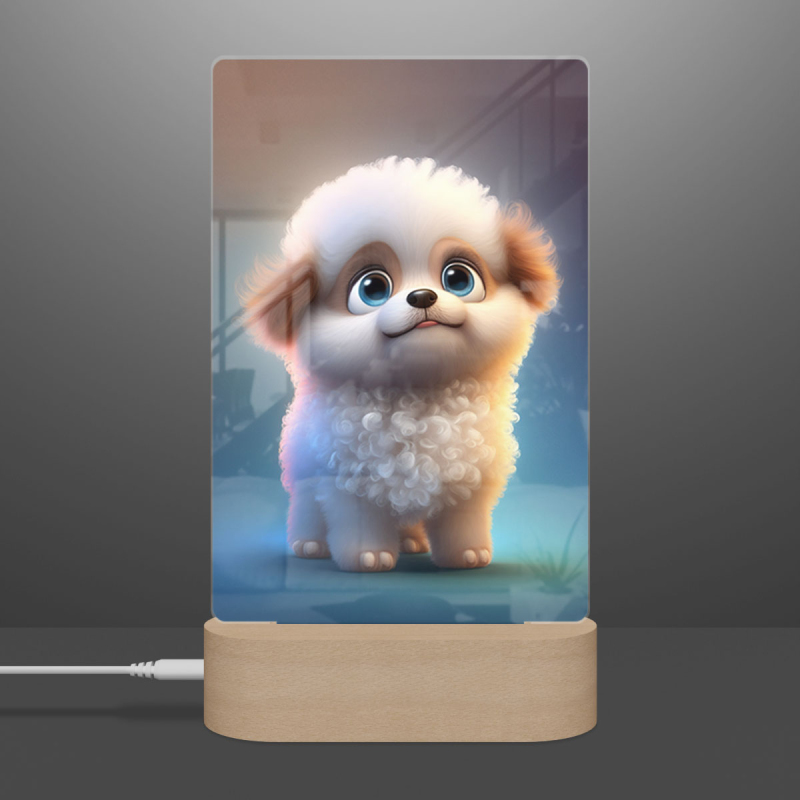Součástí balení je akrylové sklo dle výběru, dřevěný RGB LED stojánek a napájecí USB kabel.