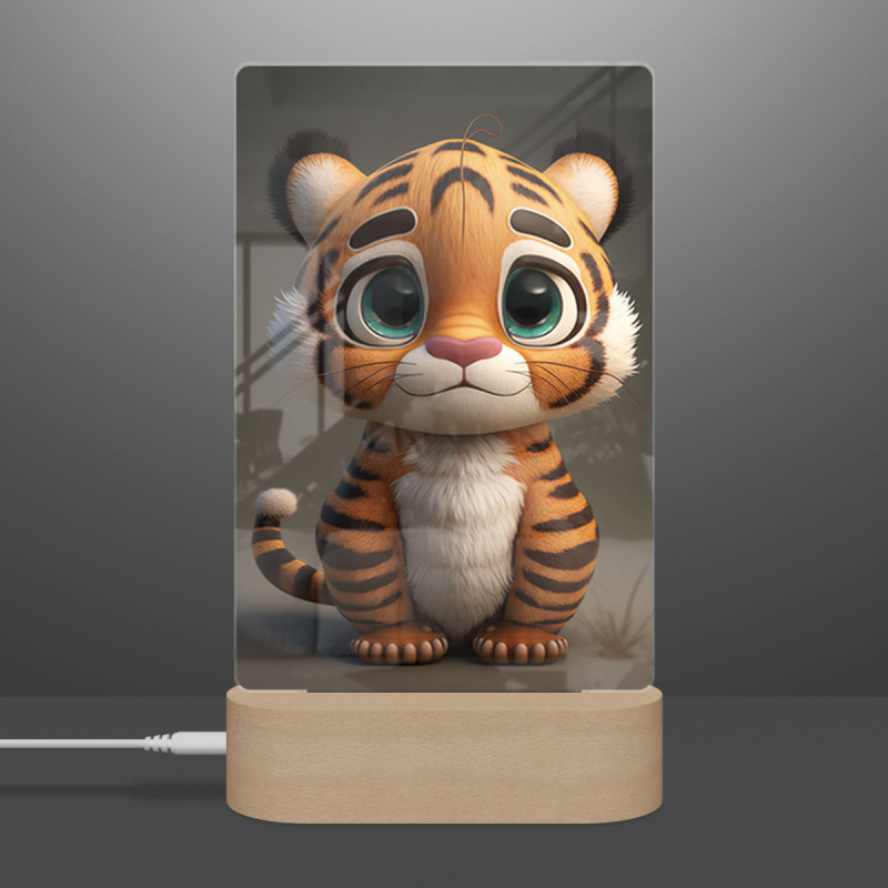 Součástí balení je akrylové sklo dle výběru, dřevěný RGB LED stojánek a napájecí USB kabel.