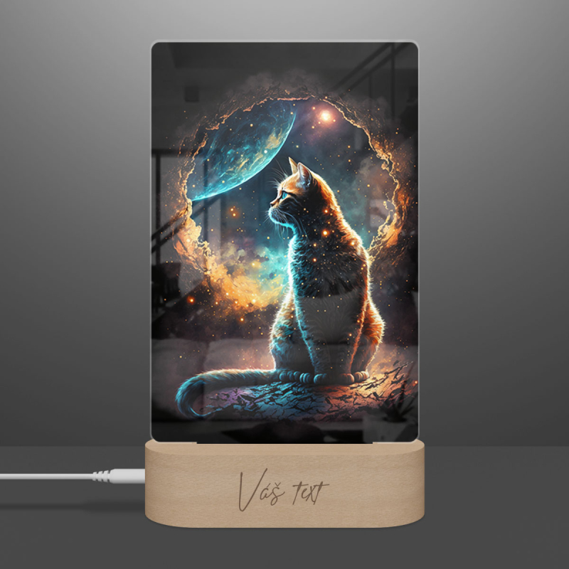 Součástí balení je akrylové sklo dle výběru, dřevěný RGB LED stojánek a napájecí USB kabel.