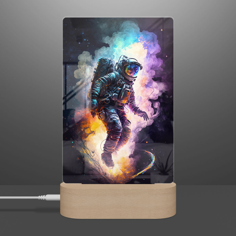 Součástí balení je akrylové sklo dle výběru, dřevěný RGB LED stojánek a napájecí USB kabel.