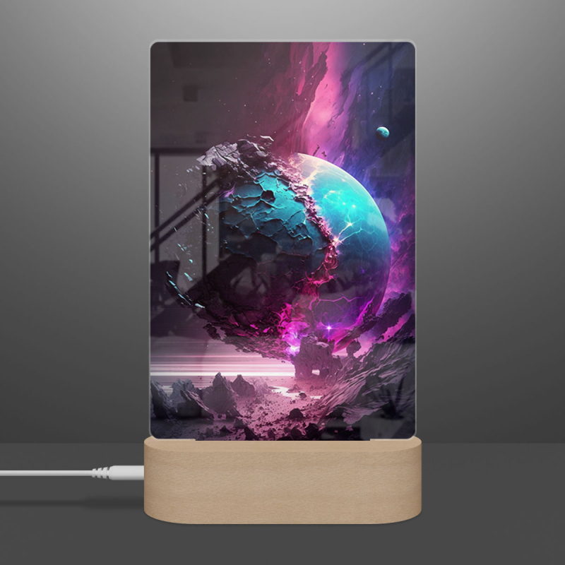 Součástí balení je akrylové sklo dle výběru, dřevěný RGB LED stojánek a napájecí USB kabel.